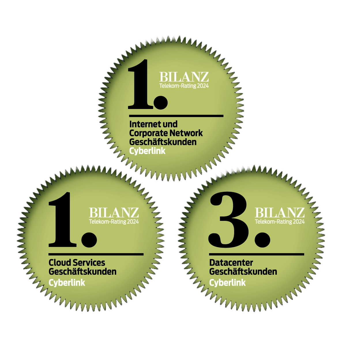 Bilanz Telekom Rating 2024 - Doppelsieg der Cyberlink AG im Bereich «ISP & Corporate Networks» und «Cloud Services».