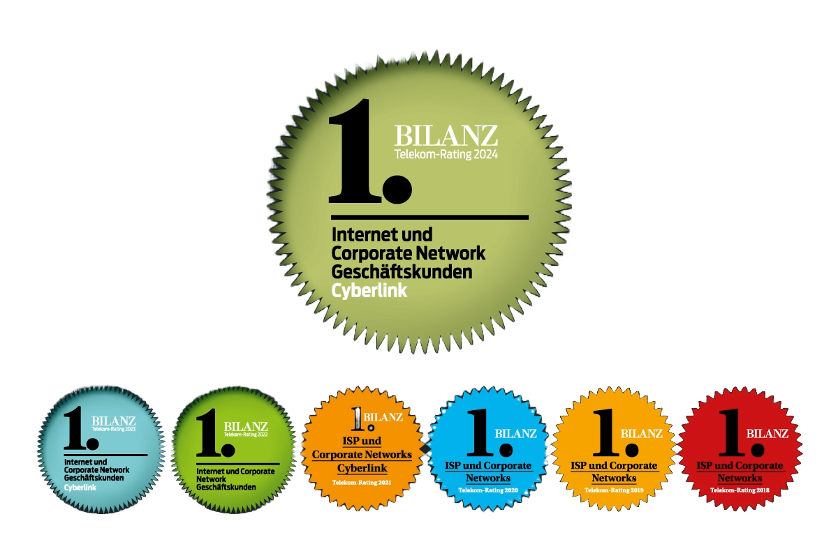 Wieder Platz 1 für Cyberlink im jährlichen Telekom-Rating des Wirtschaftsmagazins Bilanz: Über 1'000 Geschäftskunden aller Grössen aus der ganzen Schweiz haben dem unabhängigen ICT-Dienstleister aus Zürich in der Kategorie «Internet Service Provider & Corporate Networks» Spitzennoten gegeben. Mit einer Gesamtpunktzahl von 24.43 liegt Cyberlink über einen halben Punkt vor dem Zweitplatzierten, der 23.83 Punkte verbuchen konnte. Bestnoten erhielt Cyberlink für Support (5.31), Flexibilität (5.28) und Qualität (5.07) und belegt damit bereits zum siebten Mal in Folge den ersten Platz. Das Bewertungssystem entspricht dem Schweizer Schulnotensystem von 1 bis 6 und die Kriterien der Wahl fokussieren auf Qualität, Innovation, Preis, Flexibilität und Support.