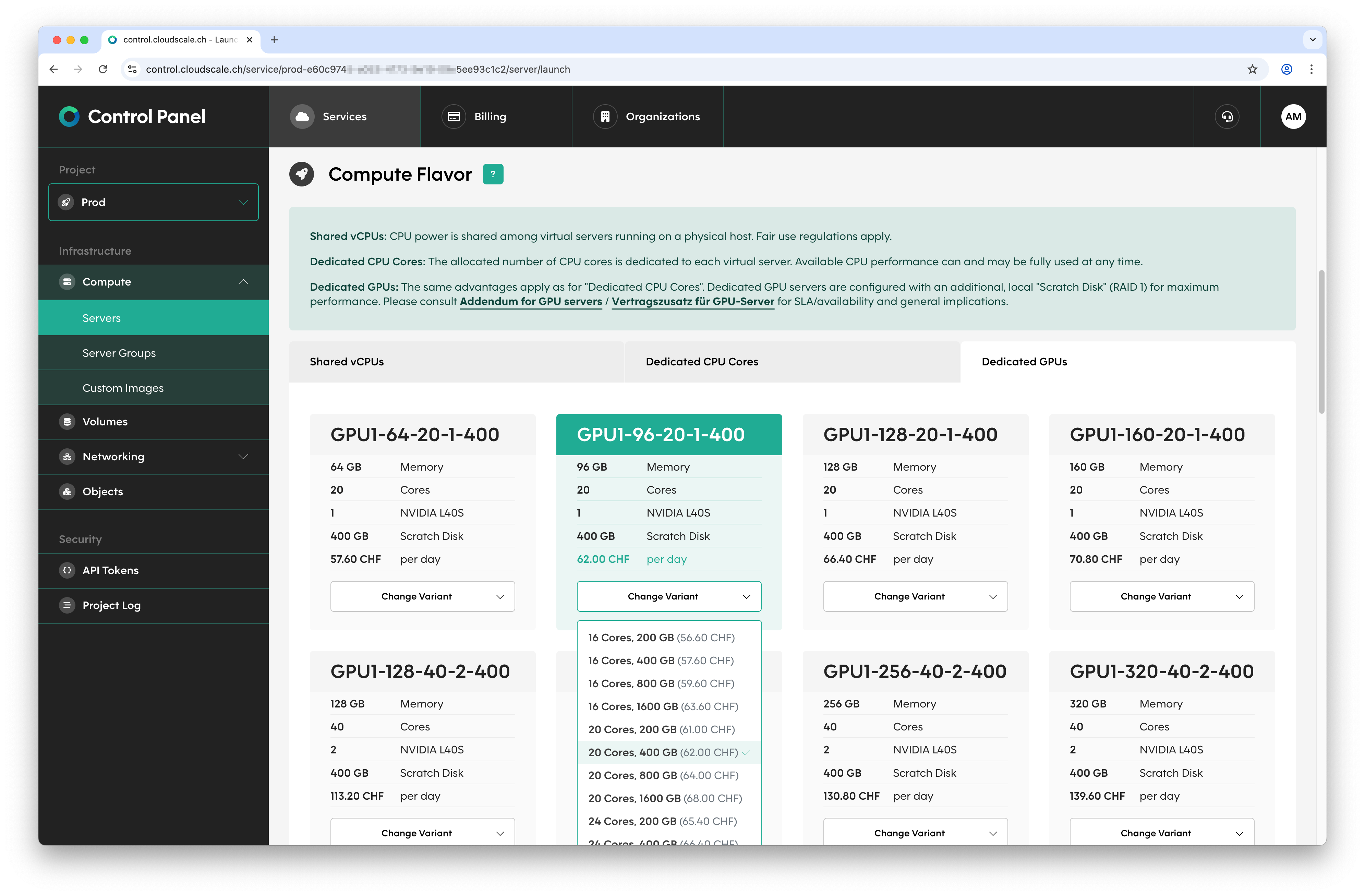 Beim Erstellen eines neuen virtuellen Servers in unserem Cloud Control Panel findest du die GPU-Flavors im Tab "Dedicated GPUs". Bitte benutze einmalig den Link "please contact support" und gib uns die Eckpunkte deiner geplanten Nutzung an; als Attachment benötigen wir den unterschriebenen "Vertragszusatz für GPU-Server". Nach einer manuellen Prüfung schalten wir die GPU-Flavors für Dein gewünschtes Projekt frei.